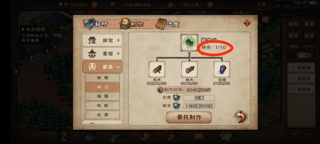 洛阳(23,17)司户令处选择家宅,购买地契。房屋规模共有6种,分别为:陋室(40两)、瓦屋(100两银子)、别屋(200两银子)、小筑(500元