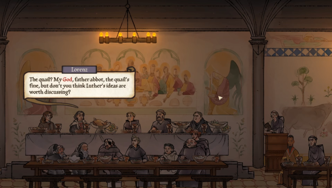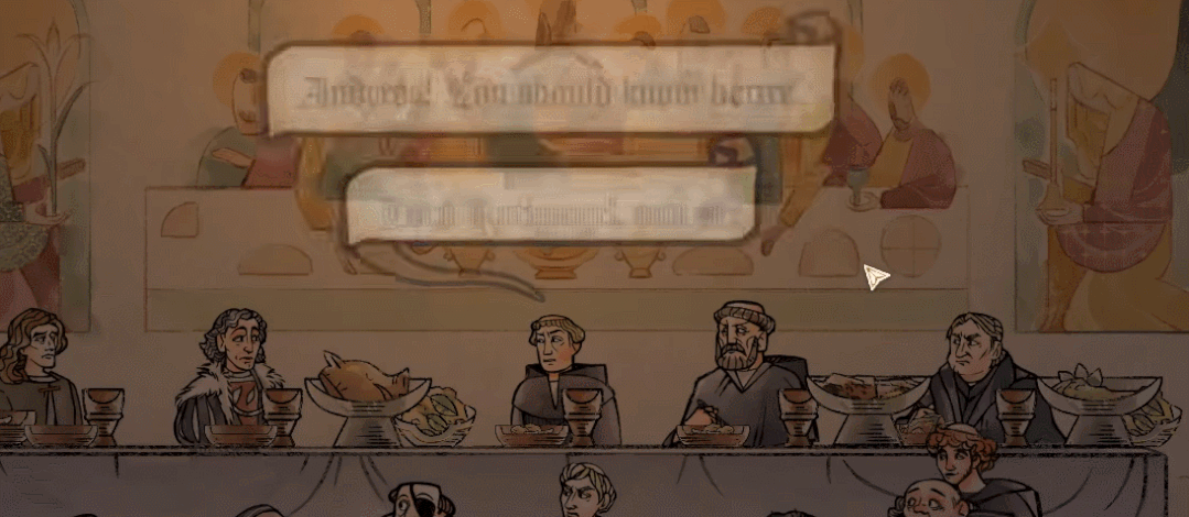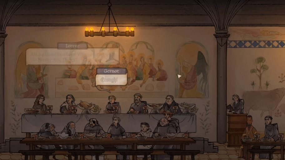 这一问题,参杂了男爵与修道院的微妙联系,背后也包含了活字印刷变革让宗教与教育的快速传播,以及Tassing村庄的农民与修道院的紧张关系,提醒玩家这局晚宴正处在历史的漩涡当中。