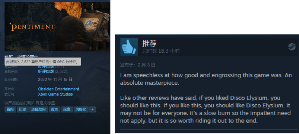 这游戏在Steam上也收获了96%的好评「好到无话可说的杰作,若喜欢《极乐迪斯科》,一定要试试 」