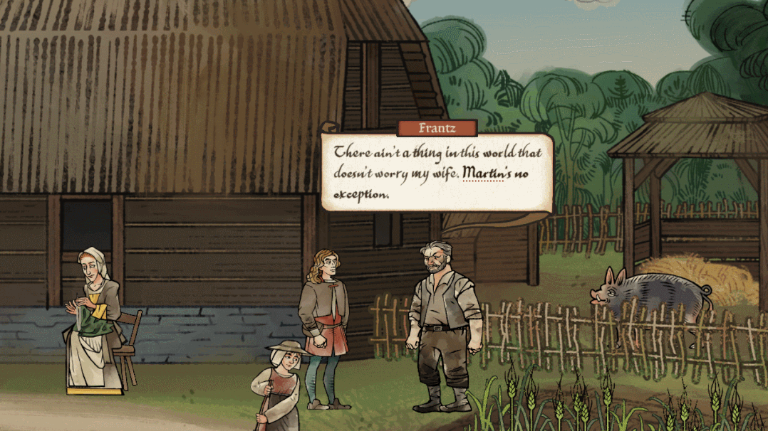 游戏内容也是如此。《Pentiment》所描绘的变革年代,在Tassing村庄搭建出了一种特殊氛围——每个人身处其中,每个人也在谈论变化。