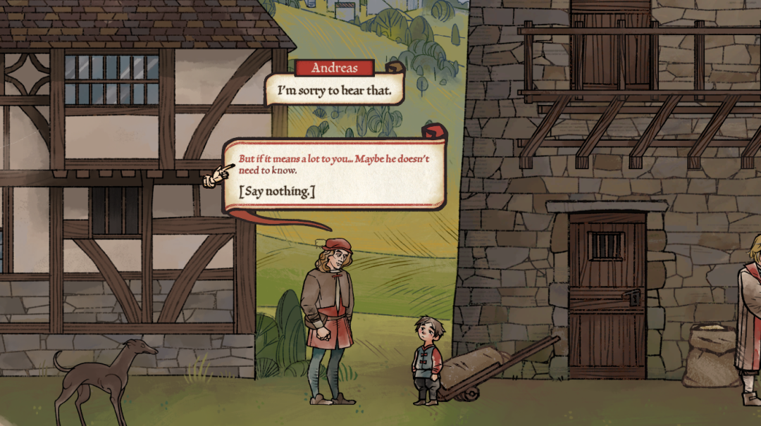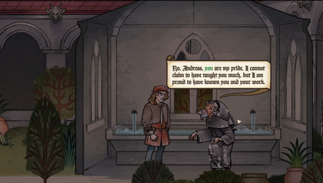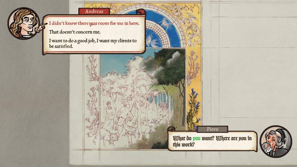 《Pentiment》的「选择-结局」之所以不重要,在我看来,是因为它们都是在完善Andreas这个角色,让玩家选择以怎样的人际关系、事件经历,来体验《Pentiment》所精心搭建的环境。因此所有选择,都被拆解到与每一个人的社交过程,也不会明确指向某个功利的结局。