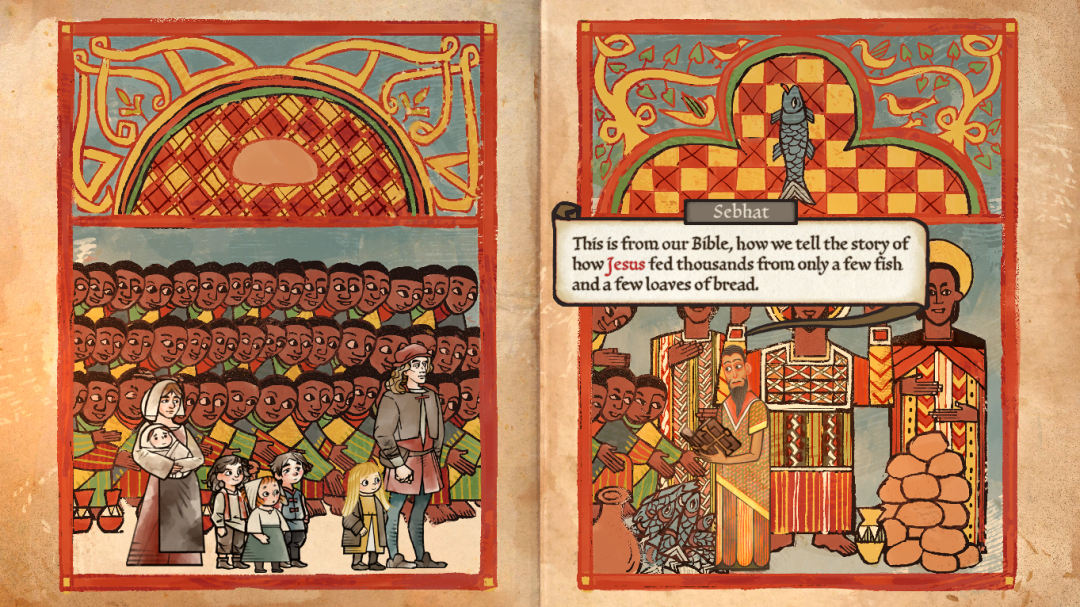 在交互时,游戏画面是镶嵌在一本书中的插画。当对话中出现历史词汇,玩家可以拉远视角,看到书本对插画中的词汇如注脚般作出解释。而每当角色跨越场景,画面会如翻书一般,到绘本的下一页。