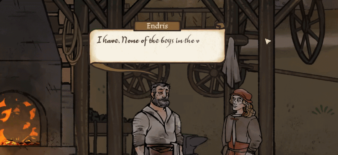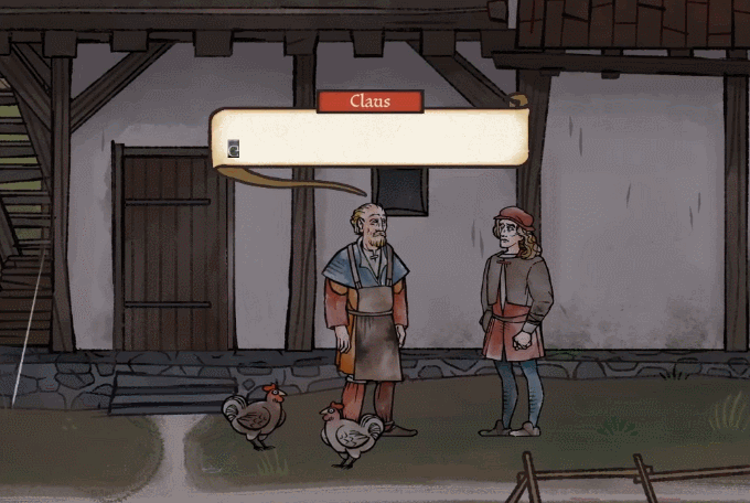 有时,为了表达角色的窃窃私语,字体大小也可以成为表达方式。在Andreas与磨坊家儿子聊天时,知道他很喜欢画画,但他爸爸不喜欢他做这些不务正业的事情,所以二人聊起有关画画的话题时,文本会比正常其他内容的字体小上许多。