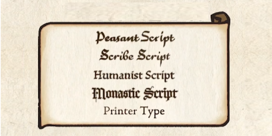 《Pentiment》设计了5种不同的字体。每一种字体可能暗含了角色的文化程度、人物性格,乃至社会地位。