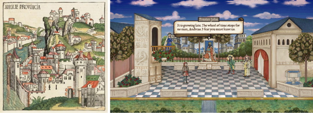 据主美Hannah Kennedy分享,他们在定下方向后,发现1493年出版的《纽伦堡编年史》与游戏的地点及年代颇为契合,遂将其作为美术参考:一种兼顾早年「手抄本」手绘质感,以及「摇篮本」中活字刊印的融合风格。