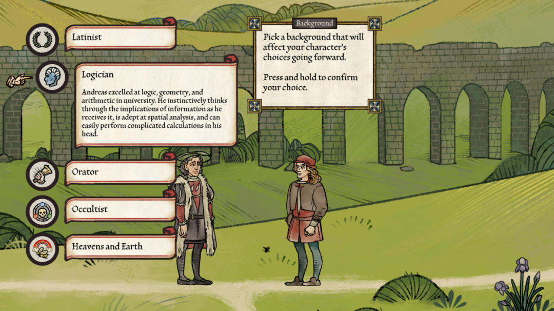 在这局故事的启程,玩家可以为Andreas选择其背景,如在何处游历学习?有什么样的职业知识?又在大学中选修了什么样的课程这些选择会影响到主角看待事件的方式,以及能否参与到某些事件当中……这也意味着,他会因为缺乏某方面的知识,在这次的故事中无法捕捉到部分重要信息。