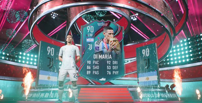 (图:只能通过SBC制作的世界杯最佳阵容迪玛利亚,卡面选择了阿根廷队夺冠捧杯时的照片,兼具纪念意义和数值,玩家几乎人手一张)