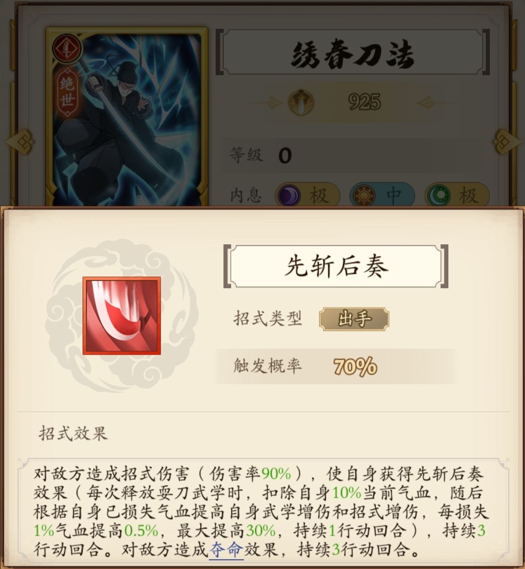 作为出手绝世本身效果不算很强。阳中的内息没法加入阳刀体系,调和刀依托答辩,阴刀不太稳定,夺命效果作为同室操戈针对阳刀的时候有奇效。