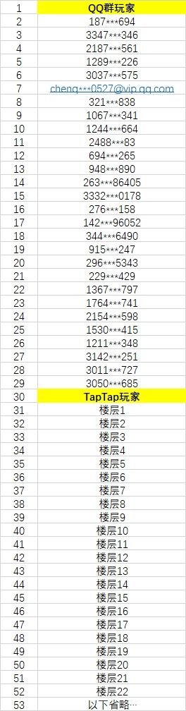 (以下为所有【QQ群+TapTap参与用户】,抽取随机数按照整合表格的第一列为准,详情见下方图片和开奖过程)