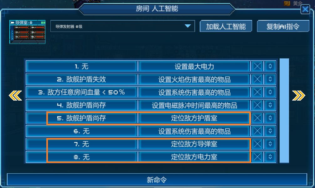 如图,你的导弹室将首先执行5号行动定位攻击敌方护盾,如果敌方护盾失效,导弹室将执行7号行动定位攻击敌方导弹室,如果敌方导弹室也被破坏了,则往下执行8号行动攻击敌方的电力室。