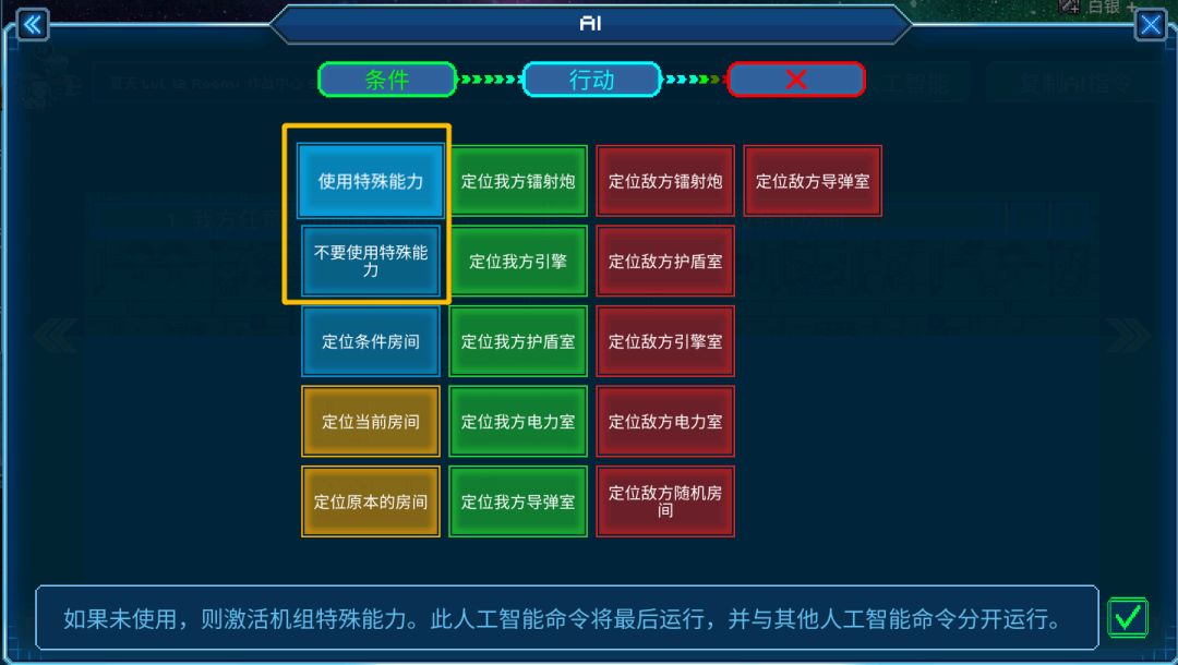 上图的AI指令执行为,当战时你的任意房间血量<100%,则船员将前往该房间进行修复。(前提是房间之间是可以任意通行)