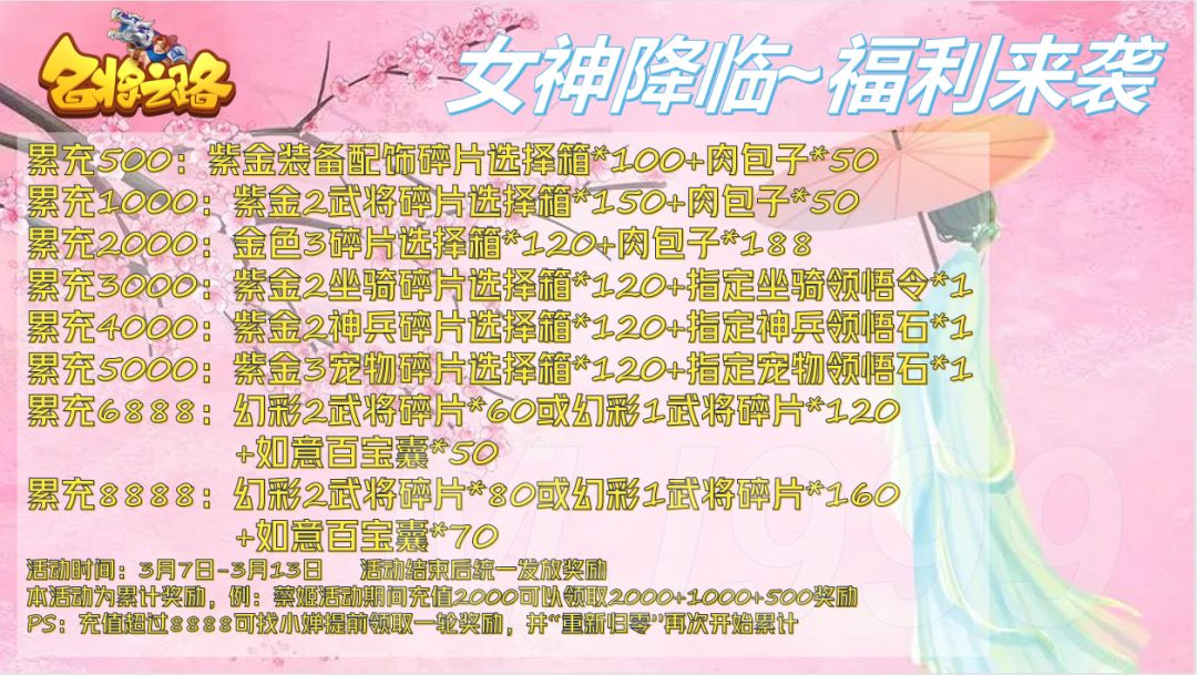 【活动说明】在活动时间内(3月7日-3月13日)累计充值达到金额可领取对应档位的大礼包哦,活动为累充奖励哦,充值高档位包含以上全部低档位奖励(例:活动期间累计充值2000元可以领取奖励合计为2000+1000+500)