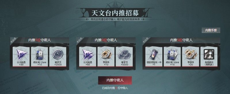 内推好友,将您的专属邀请码和入职链接、入职二维码发送好友,尚未加入天文台的守秘人通过您分享的专属链接成功入职天文台后即被视为内推成功。每内推成功一次可获得额外两次抽奖机会(以内推方式获得的抽奖次数上限为14次)。