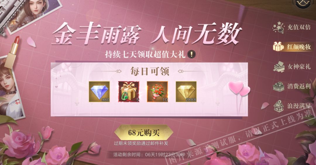 仅68元即可解锁连续7天每天领取超值大礼!每天可领取玫瑰豪华礼盒*5、蓝钻*980、捧花*10、金钻*2888,合计可领取蓝钻*6860、35个玫瑰豪华礼盒、70个捧花、金钻*20216!超值福利冲冲冲!