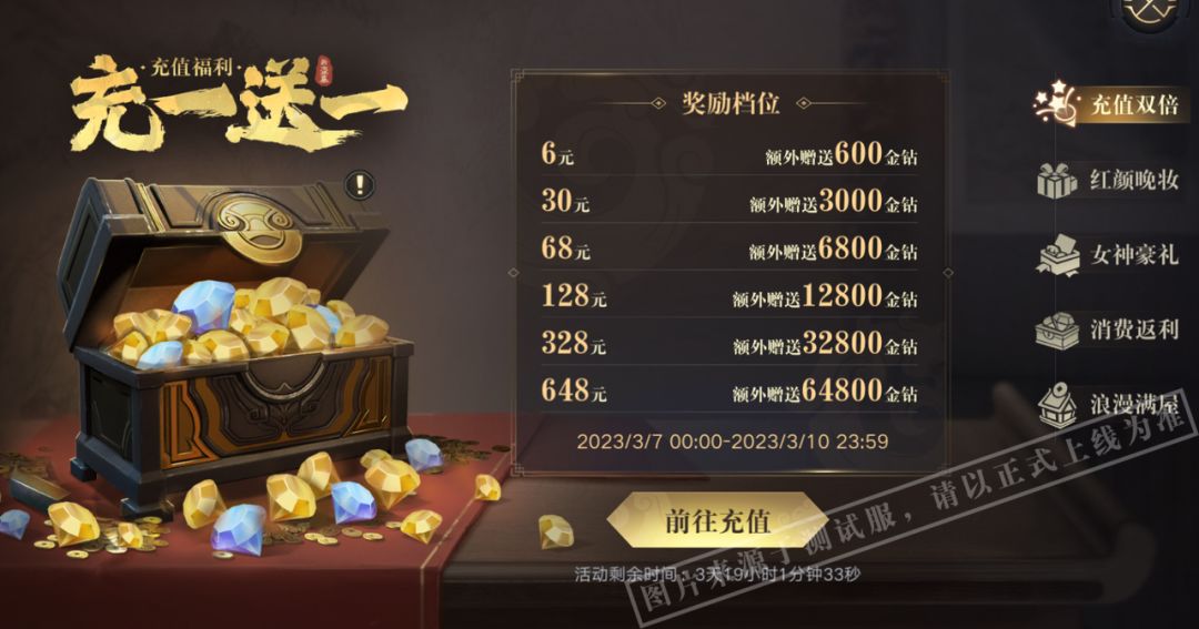 活动期间限时开启充值赠送额外金钻。