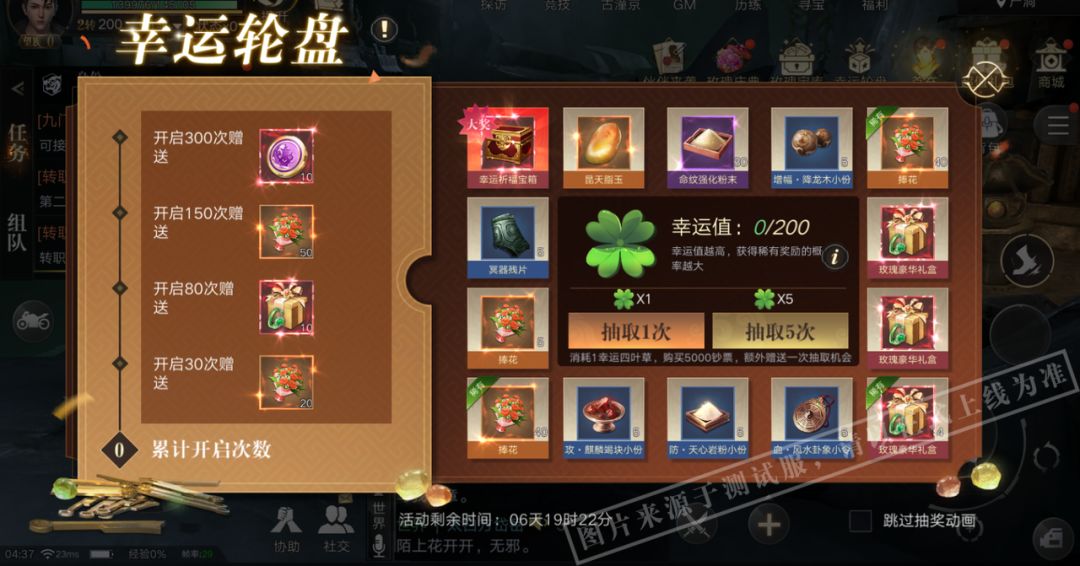 活动期间,弟子们可以通过消耗蓝钻来购买钞票,获得额外赠送的抽取机会,抽取中概率获得藏品兑换币、捧花、玫瑰豪华礼盒以及各类材料奖励!开启轮盘达到一定次数将获得额外好礼相送!