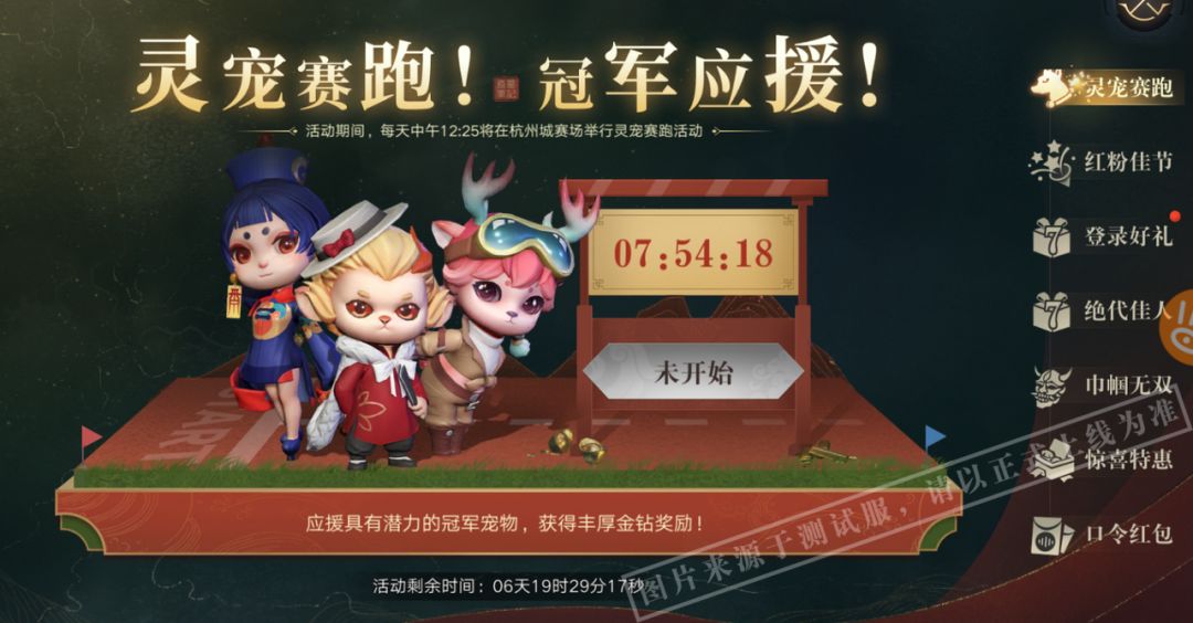 活动期间,每日的12:25,杭州城赛场将会举行3轮灵宠赛跑活动,弟子们点击活动界面中的前往活动,会自动寻路至活动地点。
