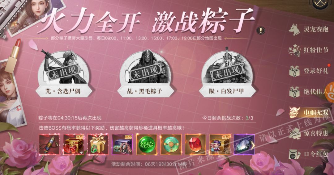 活动期间,每日的9:00、11:00、13:00、15:00、17:00、19:00,将会在尸洞、镖子岭、石道迷宫、后山中的随机3个地点将出现异常活动的粽子。异常活动的粽子在出现后的30分钟离开。弟子们每日有3次击败活动粽子获得奖励的机会。