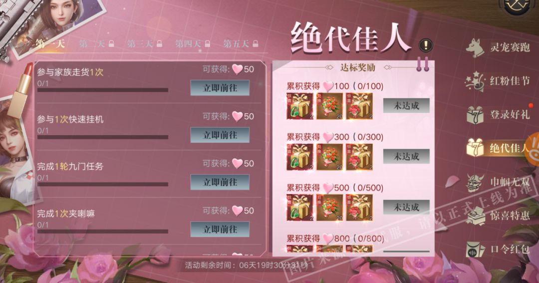 活动期间,期间登陆每天领取好礼!活动期间签到领取玫瑰豪华礼盒、抽奖券。登录6天更有新称号-宛彼鸣鸠获取!
