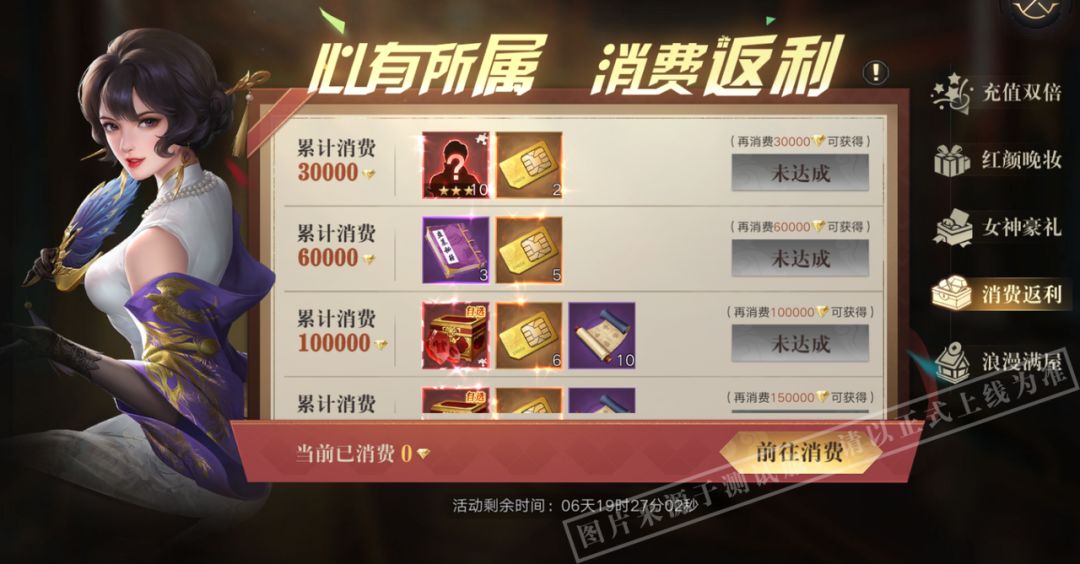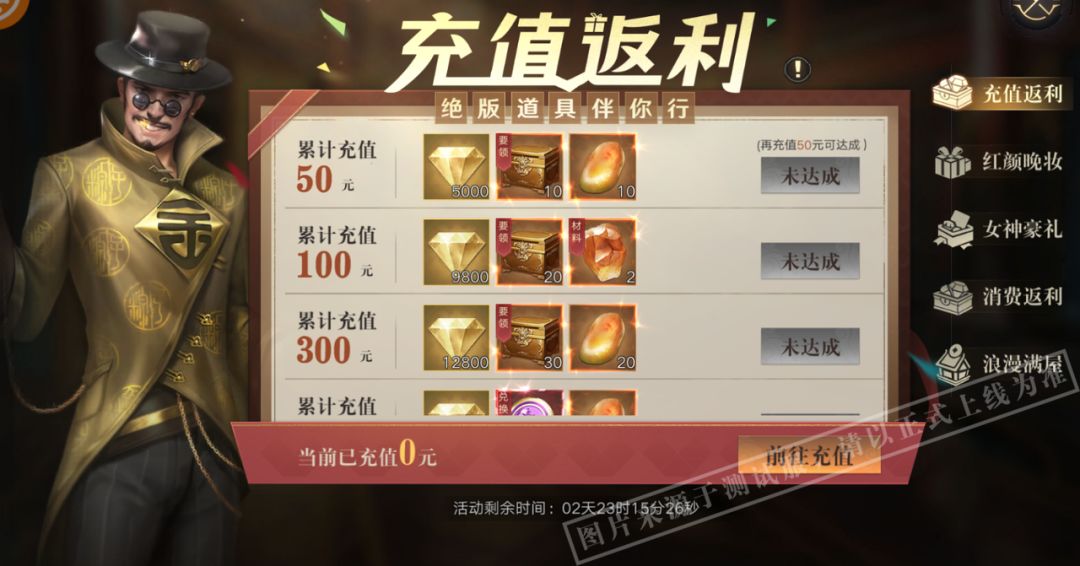 活动期间,限时开启充值返利!充值达到指定金额额外获取大量金钻、藏品兑换币等材料奖励!