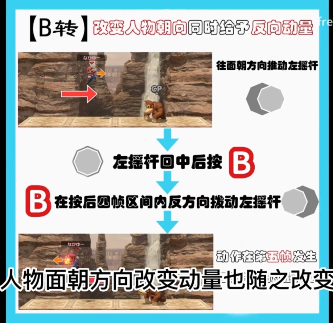方法二:空中先回正摇杆,回正后按b,然后4帧内反拉摇杆到反方向最大。