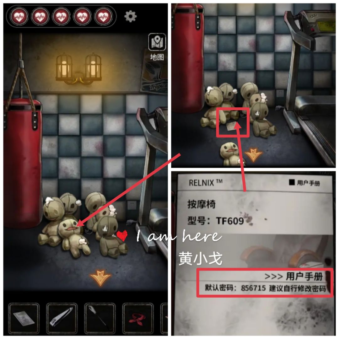 5.(心理治疗室-宣泄室)点击人偶娃娃,获得按摩椅密码:856715