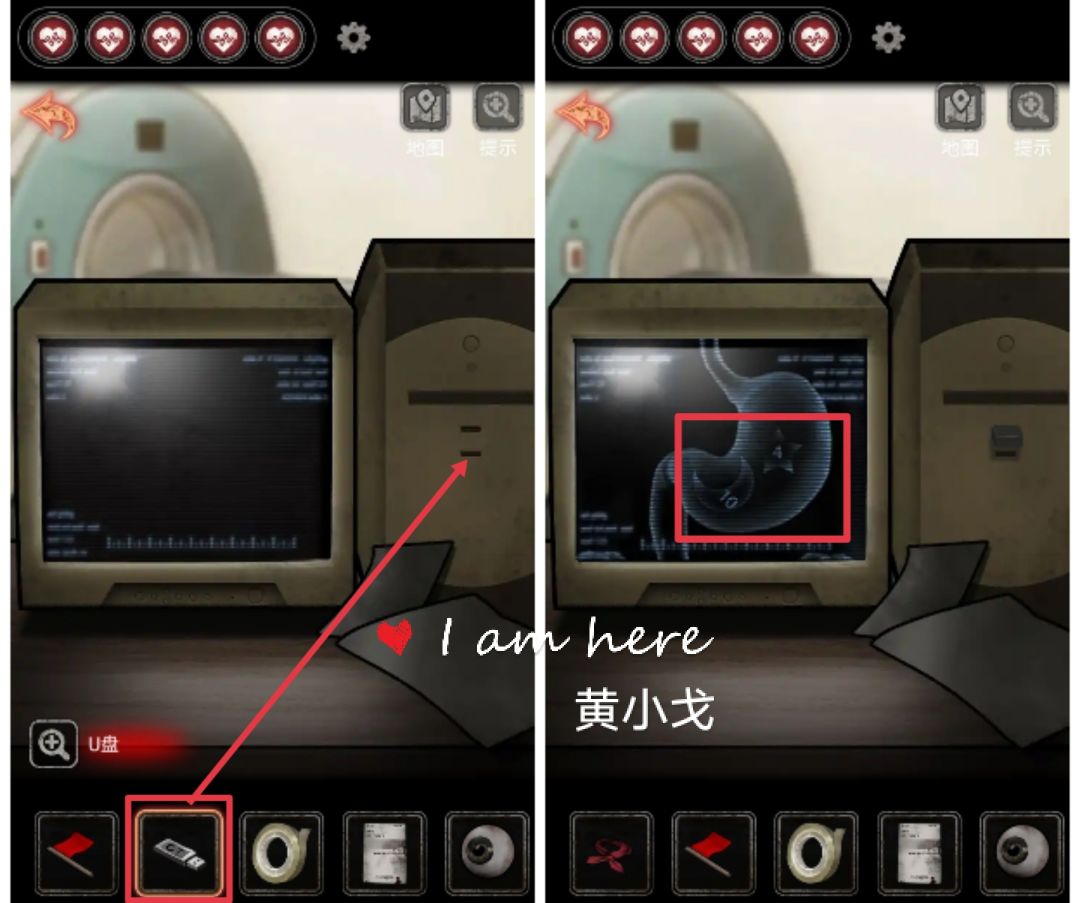 20.(检查室-办公桌)点击电脑,插入【U盘】,获得线索:月亮10,星星4