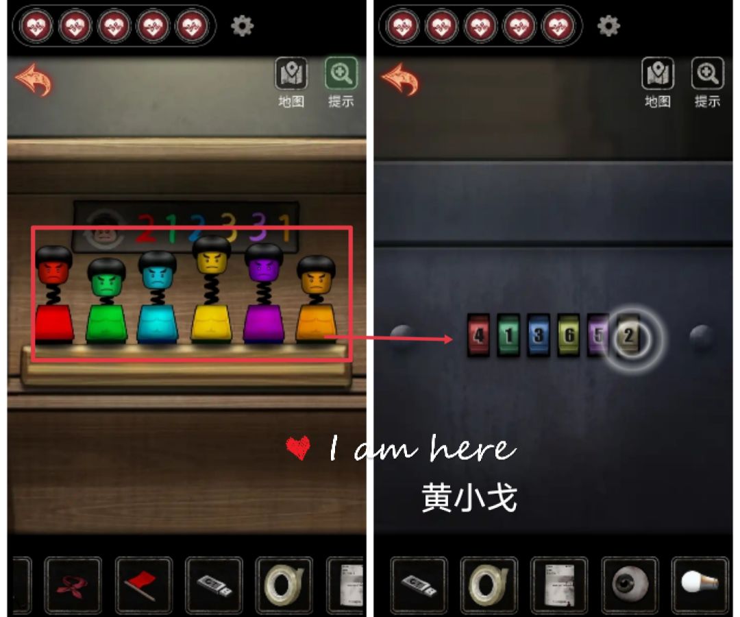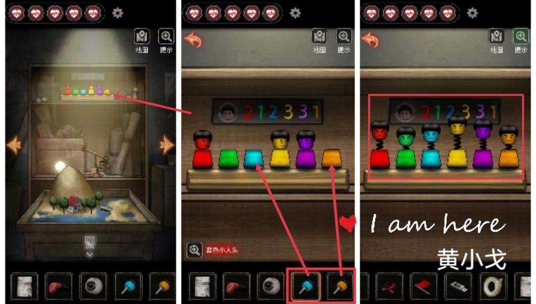 13.(沙盘室)点击柜子上的小泥人,放入三个【小人头】,根据颜色对应的数字(红2绿1蓝2黄3紫3橙1)调整小人头的位置,小泥人从高到低的顺序是:413652