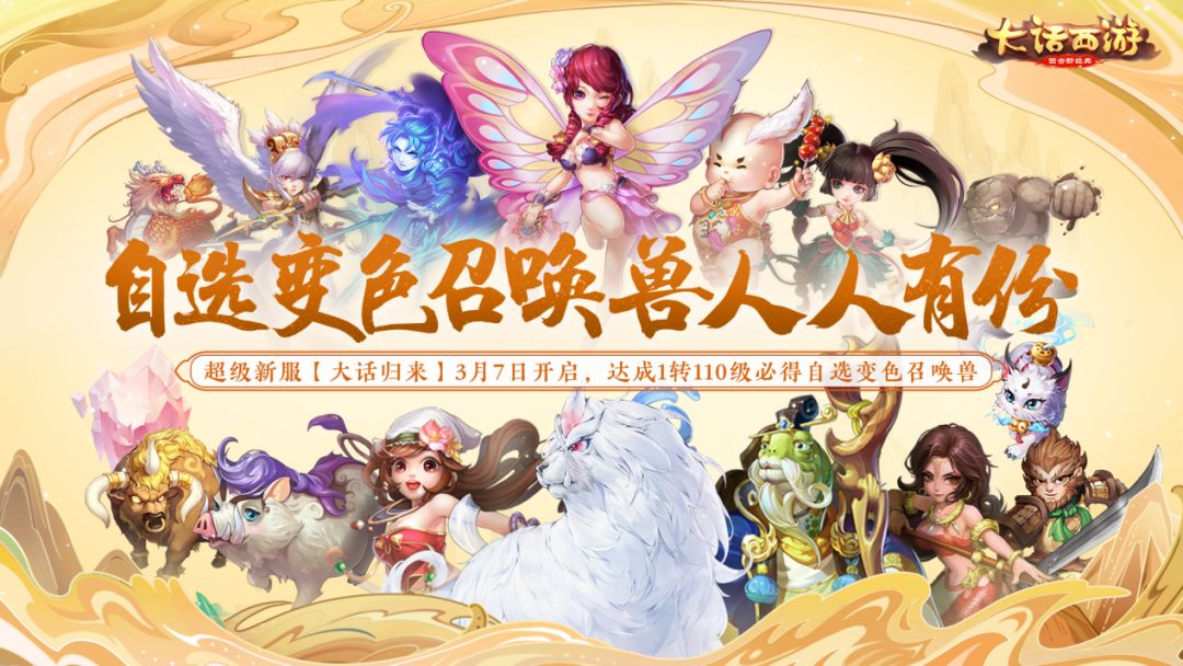 在【大话归来】新服正式开放后,前来新服的侠士只要角色达成1转110级,即可领取变色召唤兽!冰雪魔、黄金兽、猴精、迦楼罗、当康、狮蝎、龟丞相、水灵仙、泥石怪、冥灵妃子、蝴蝶仙子、火神女娲、喷火牛、麒麟、精卫、剑精灵、金不换……所有可捕捉的高级召唤兽都可自由选择!