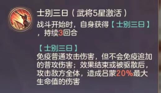 略有小成:[士别三日]无法被驱散,持续时间内受到来自敌方武将的所有伤害降低30%(从15%提升到30%);[士别三日]下遭受普攻时,100%概率(90%提高到100%)对攻击方施加[迟缓],会使目标普攻时额外消耗300点怒气。