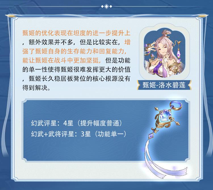 在保留原效果的基础上,提高了甄姬的坦度,强化了怜护效果,并且删除了曾经让自身受到伤害提升的负面效果,额外提供了相邻武将的抗暴率,进一步提高了自身以及队友的坦度,同时保留了对于女武将保护作用翻倍的特性。