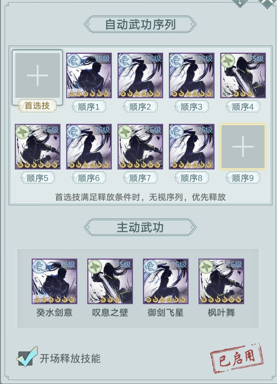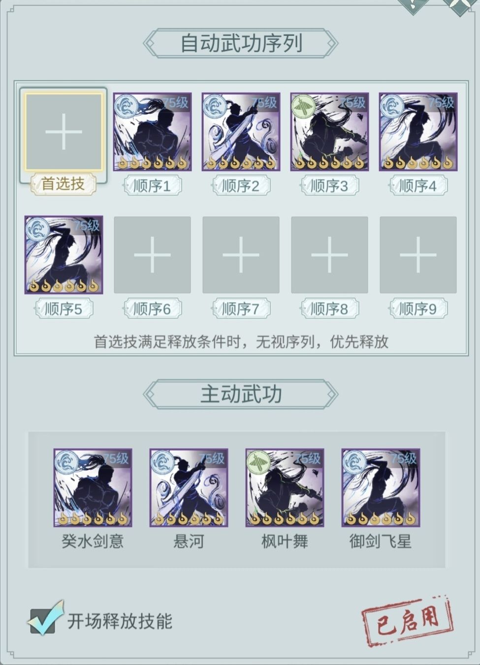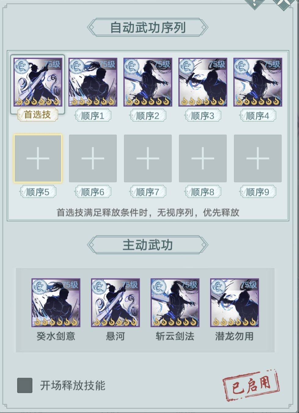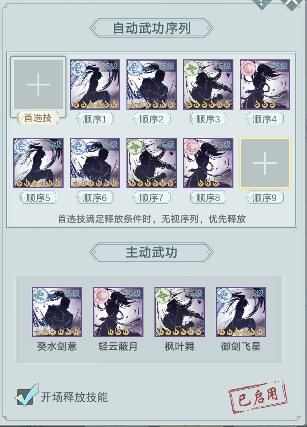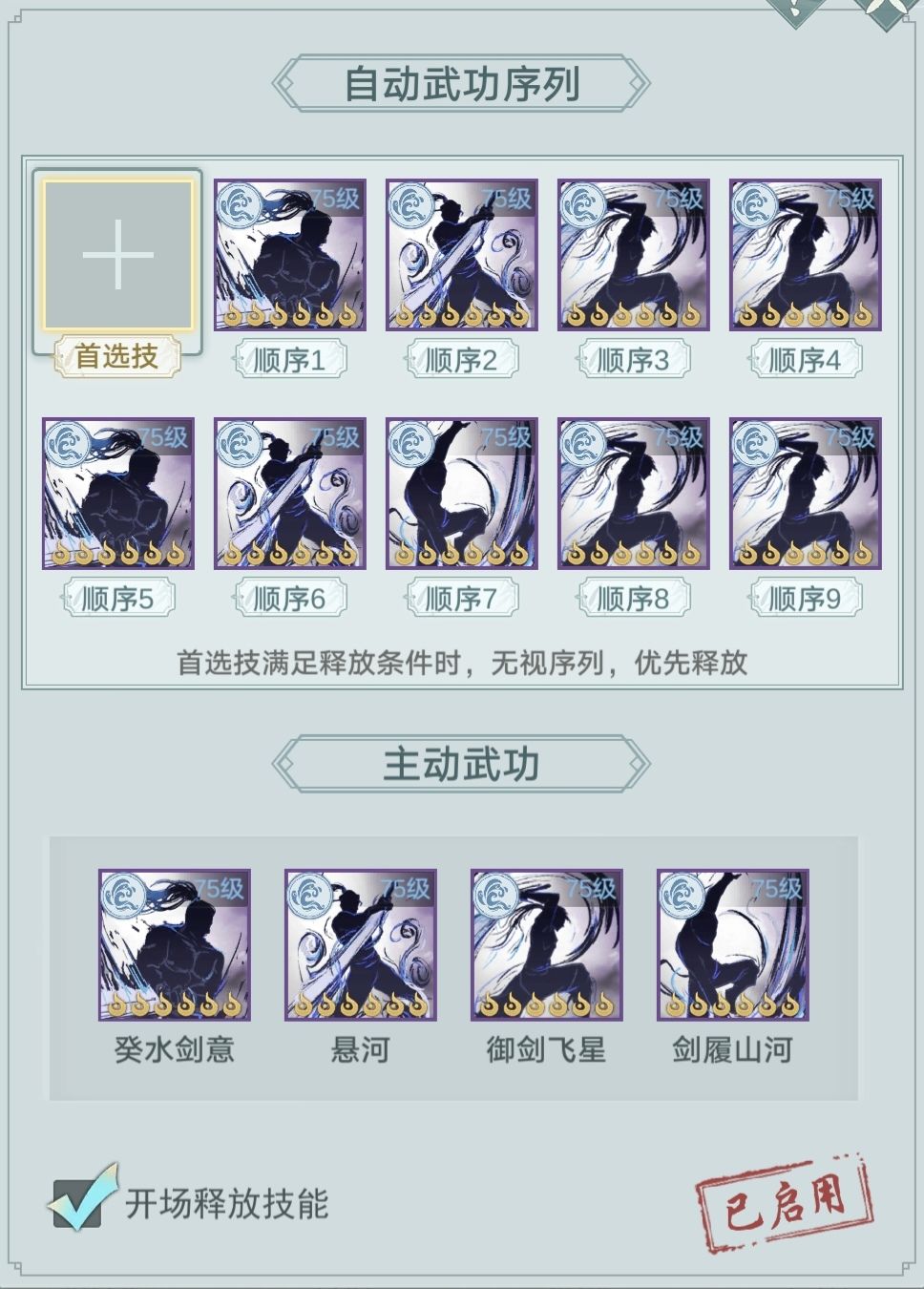 四开(开局不释放)/八开(开局释放),优选四太极,可以配六追命