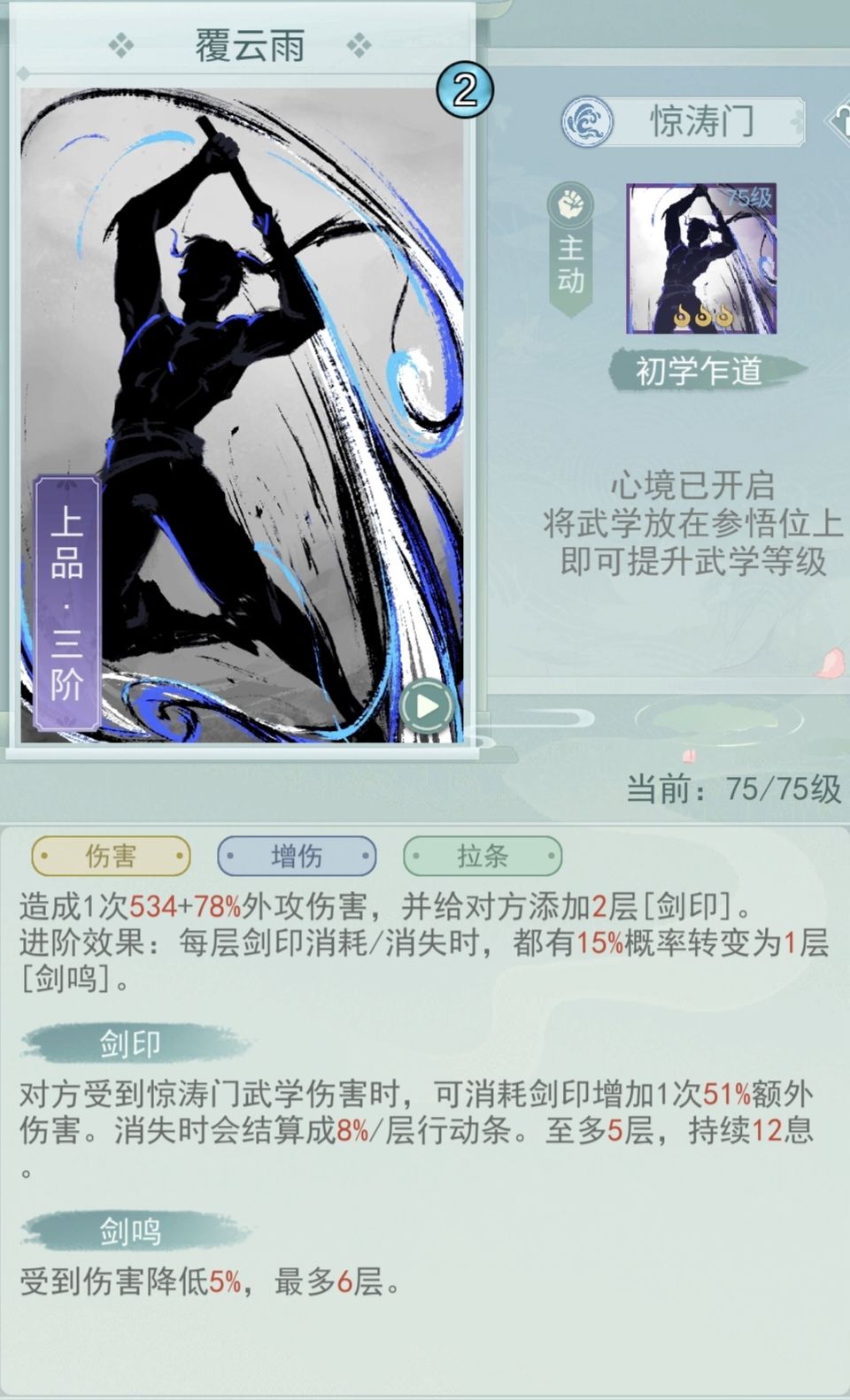 易伤:二代惊涛多是多段武学,很好搭配易伤