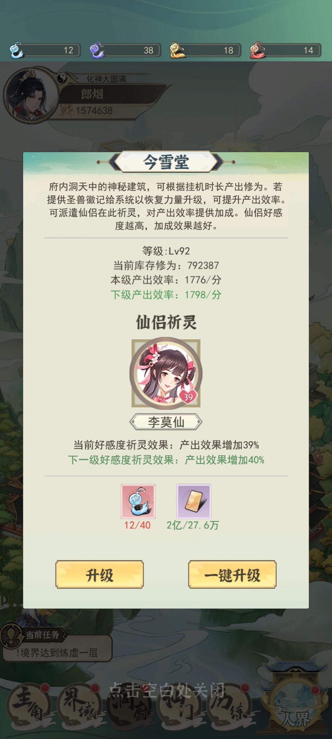 境界提升主要靠今雪堂等级,仙友等级,法宝三个方面。