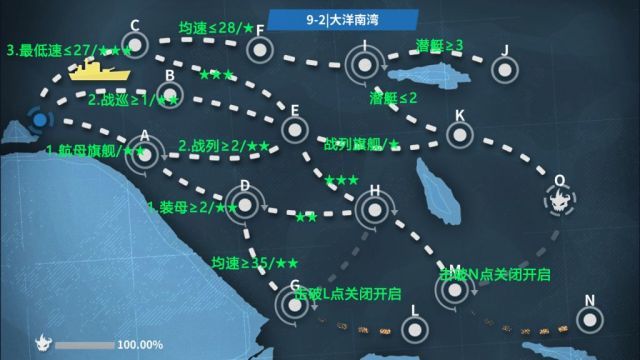 压制任务:需求为3战列打S胜,3战列+大凤+先驱+大黄蜂,院长315索敌可稳定索敌带24型旗舰,不带低速船,出门SL到A点迂回走A-E-K-O打3战,迂回失败可以不打,有后备弹走B也行,40火航母11搭载以上格子携带飞机对空值超过41即可空优阵容