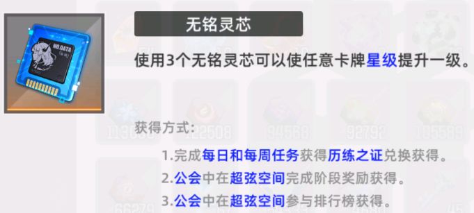 无铭灵芯:该物品主要获得方式有:1、每日任务——兑换所可每月兑换一颗;2、公会——超弦活动:全体奖励第12阶一颗;