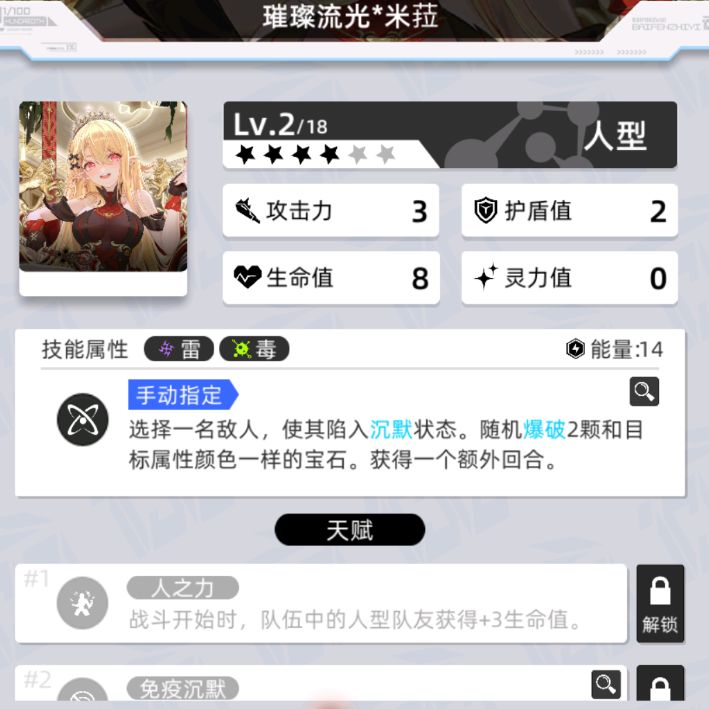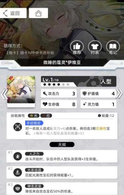 微睡的寇灵*伊维亚的技能可以与人型队友产生互动,最多创造出12颗厄属性宝石,并且由于她自己是光厄属性,在搭配任意3个人型队友时可以同时做到输出和自身循环充能,具有单回合团灭对手的能力,是一张非常强力的单卡。