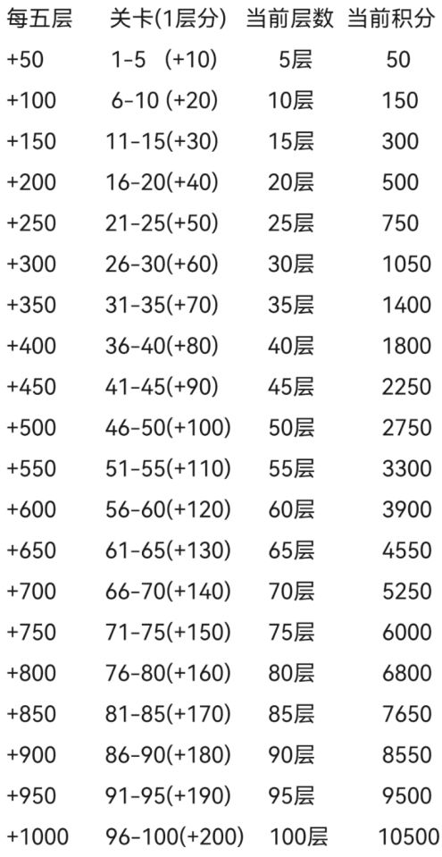 积分计算规则如下:起始积分为0,通关第一关获得积分10,每5关后奖励的积分+10。