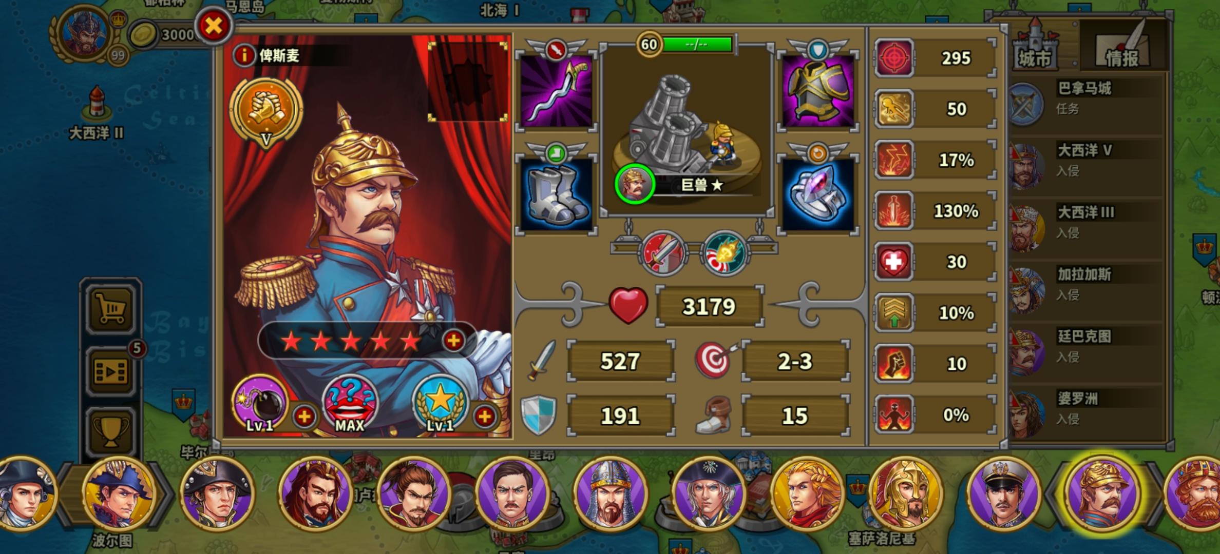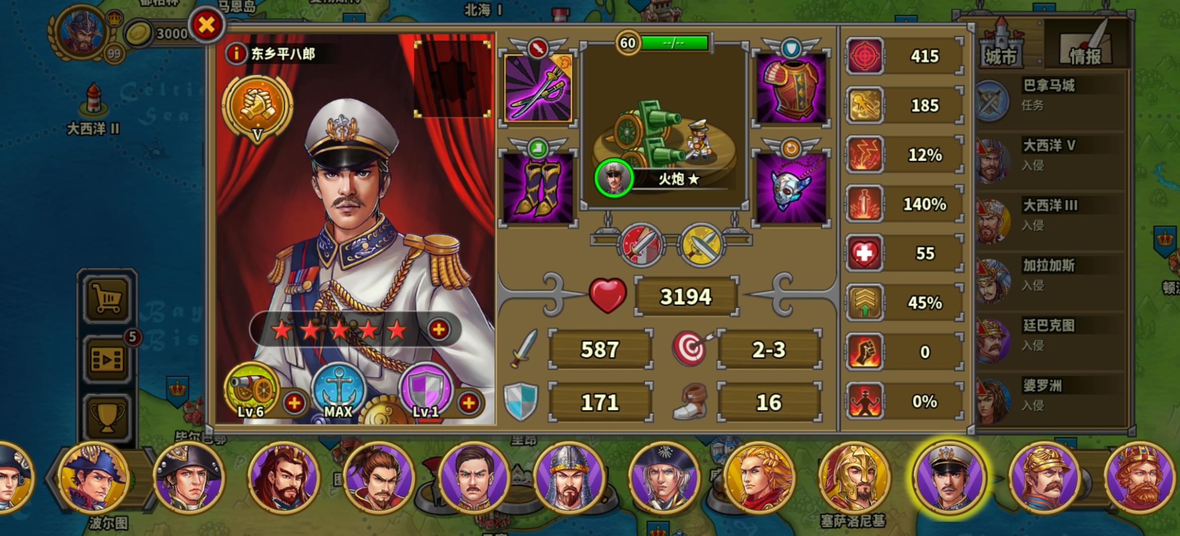 还有就是炮兵,没这么多资源,只有拿皇,东乡平八郎和啤斯曼也才60,个人更偏向东乡平八郎,一局带三个炮感觉伤害不够,其他炮兵够我打试炼的就行,想问问大佬对炮兵的见解