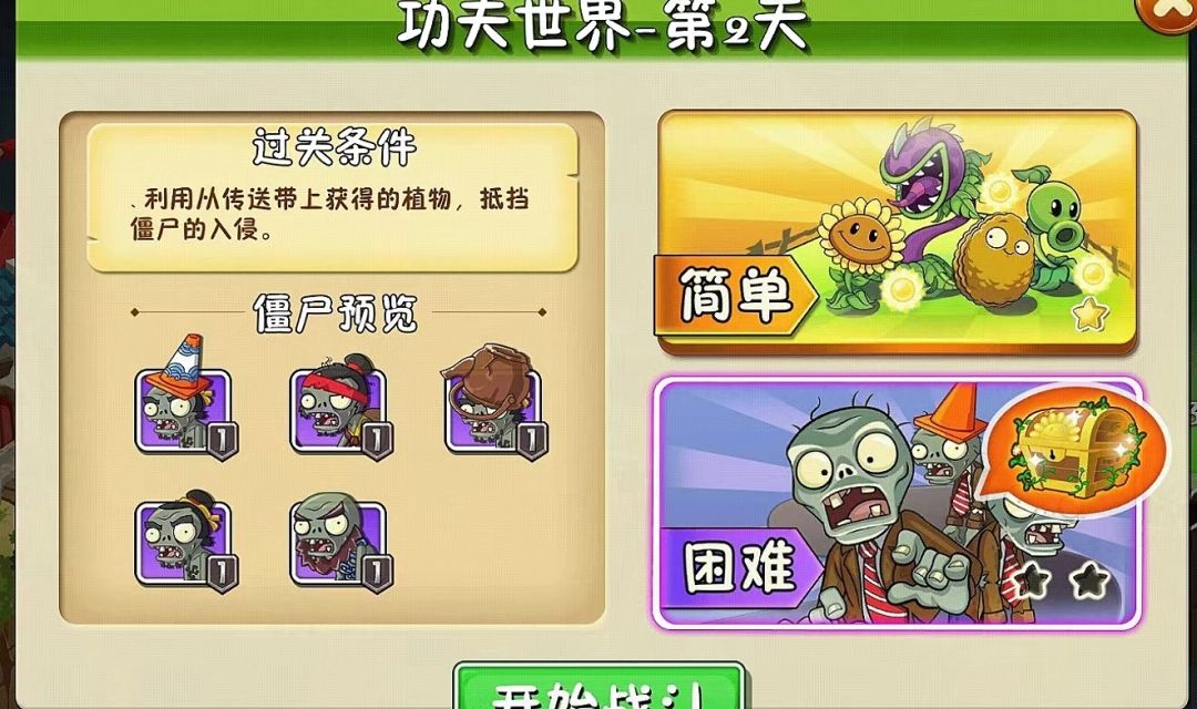 故事发生在功夫世界--一个富有中国武术特色,充斥着功夫世界僵尸的国度。首先我们先来了解本关的通关条件。通关条件:这个关卡是需要玩家利用传送带上的植物,抵挡僵尸的入侵,这一关相比上一关难度略微增加,难度就在于不能自己挑选植物,但是在这一关上新了一个植物,火葫芦,火葫芦是比较克制功夫世界中的锤子僵尸的,相信玩家也是比较期待这个植物的。