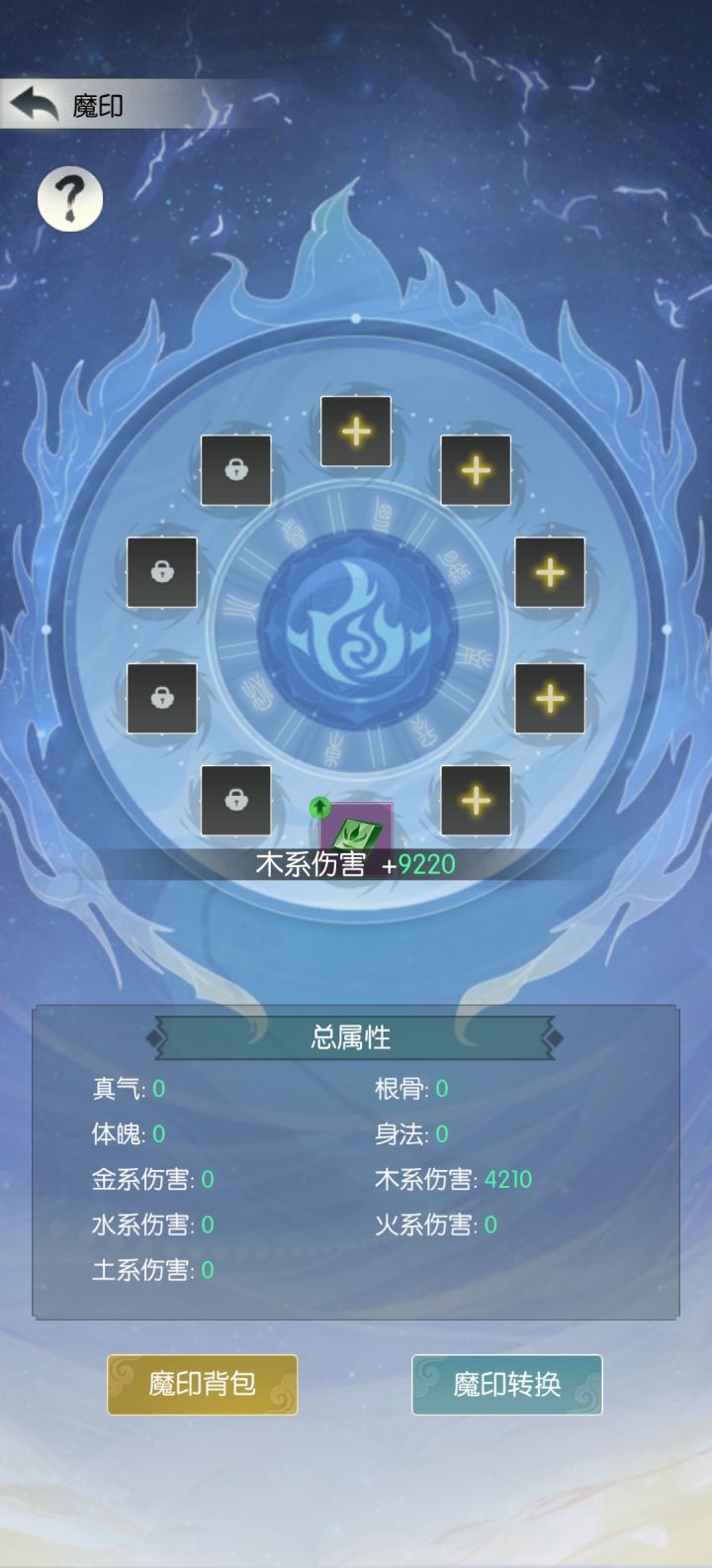 图2,V2版魔印,五级魔印,魔印面板为9220,总属性显示为4210,实际加成为9220。