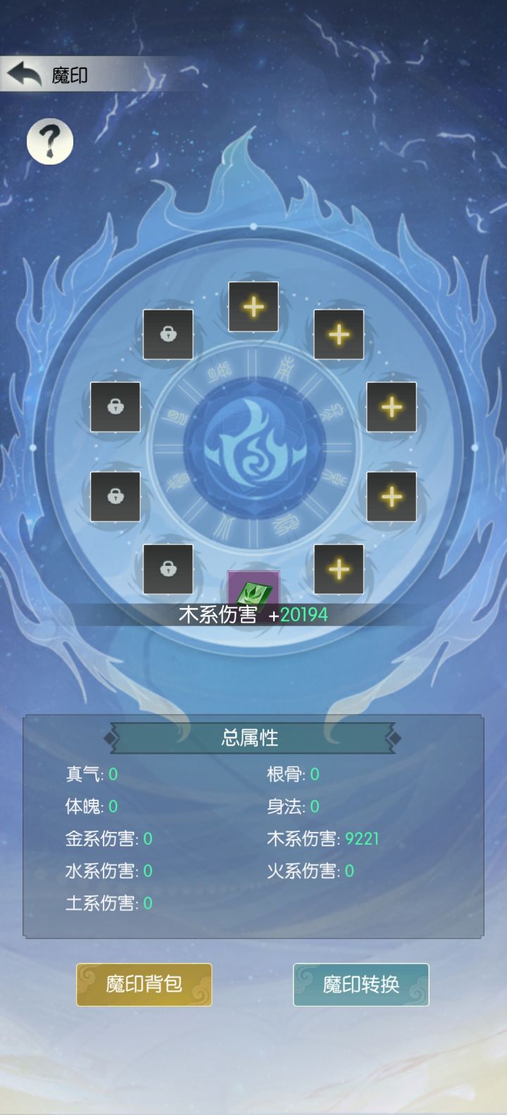 图1,V1版魔印,五级魔印,魔印面板为9220,总属性显示为9220,实际加成为20194。实际加成系数2.19,符合实际。