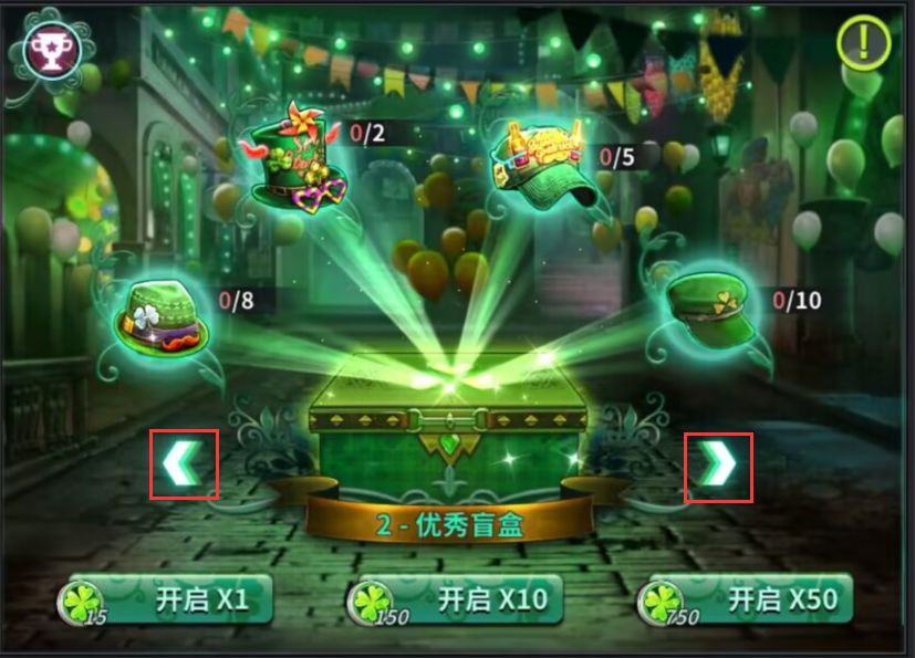 2.盲盒分为5种,可点击箭头切换,每种里包含4种帽子,数量均不相同,玩家可消耗对应数量的幸运币开启不同的盲盒