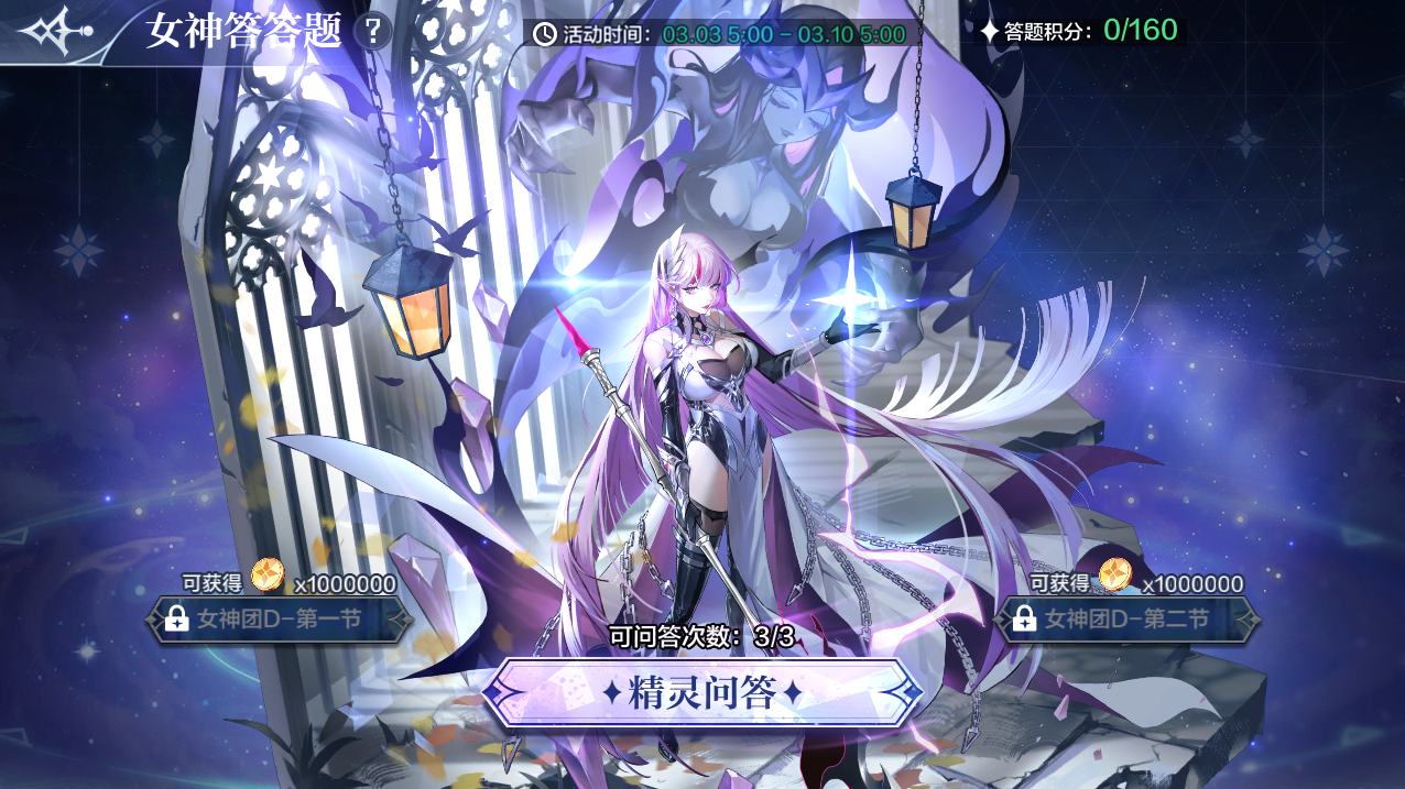 活动内容:本周女神大赛新增“女神答答题”!完成答题游戏即可获得进度奖励:金币*200万!每周任务更新,完成任务得应援棒,一起来为女神打call吧!