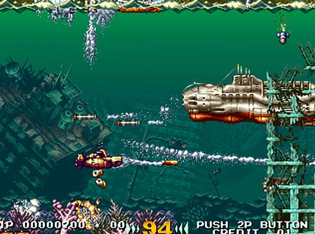 后来《合金弹头3》里Q版潜艇大战的前身就是《海底大战争》,游戏虽然是横向卷轴STG,但富有创意的还是玩家驾驶的并非是灵活的战斗机,而是胖乎乎、慢吞吞的潜水艇。