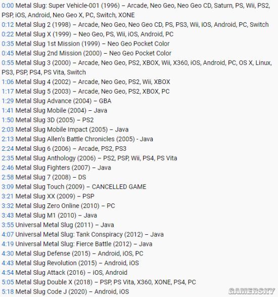 视频展示了从1996至2020年中的共29款《合金弹头》游戏。《合金弹头》系列曾登陆过街机、微软与索尼的主机以及安卓与iOS系统的移动端等众多平台。视频中出现的系列游戏名称、发售年与登陆平台如下表所示。