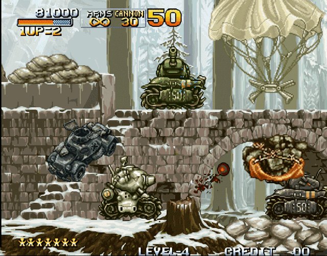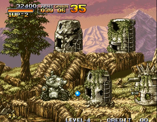 在初代《合金弹头》的设想里,玩家是控制小坦克而非是人类角色来战斗,正好NEOGEO主机四个按键负责调整枪口方向,现在想想多少还有点奇怪呀!