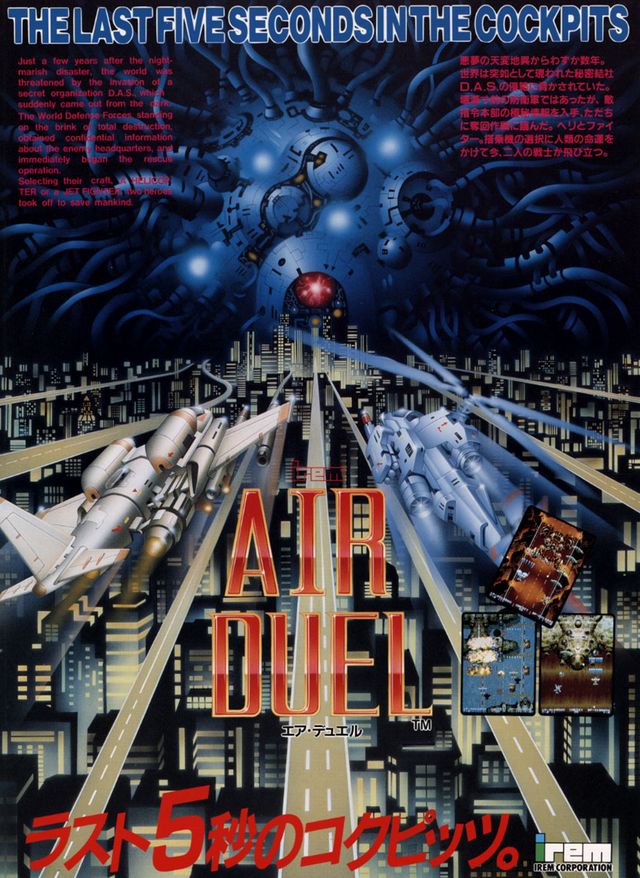 1990年一款名叫《空中决斗》的街机STG游戏发行。这款游戏九条一马参与了开发,团队一共6人,属于是小制作。尽管游戏反响平平,不过《空中决斗》却也启发了日后的《合金弹头》,游戏BGM的制作人是为日后《合金弹头》谱写BGM的冷牟田卓志。