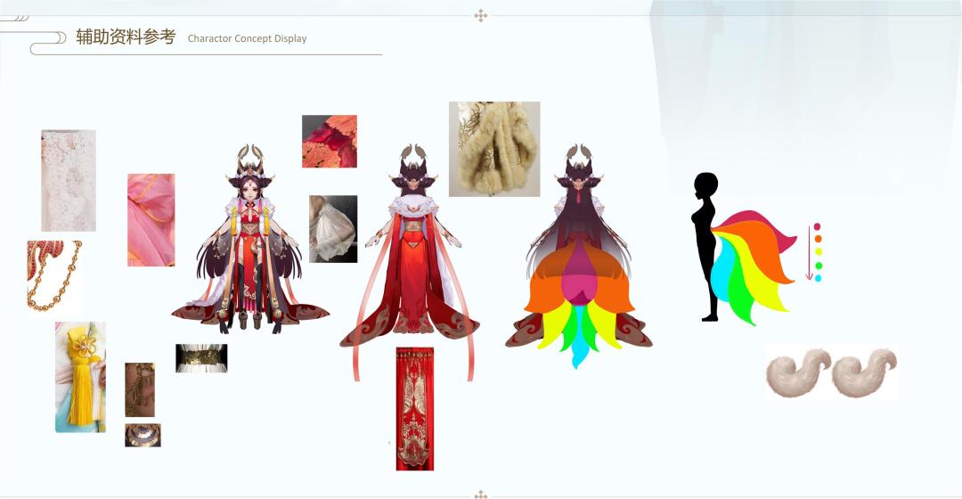 在商朝覆灭之后,妲己被擒,姜子牙下令将其斩首,行刑的士兵却遭到妲己魅惑,居然双手无力,无法行刑。为了突出妲己狐狸妖媚与娇俏的气质,我们在她的妆容、发型、头饰、配饰、武器都设计添加了许多狐狸的元素;