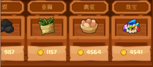 今天一共增加了五种商品:禽蛋、煤、亚麻、珠宝、水果。新货品一上架,大家活儿都开始抱怨了。刚出来对于这些个价格没有一个具体的概念,只能靠着多买几回总结价位。这个倒是比较容易,而新的货品一出现随之而来的小道信息就会尽数增加。这些小编目前还没整理出来,不过相信应该很快就阔以了。然后价格的话相信大家都看出一点端倪出来了。这些新增的货品和我们以前的商品有很多是能够对应起来的。小编整理了一下价格你可以稍微参考参考:禽蛋--蔬菜150--300(价位差不多,小道信息挺多。 )